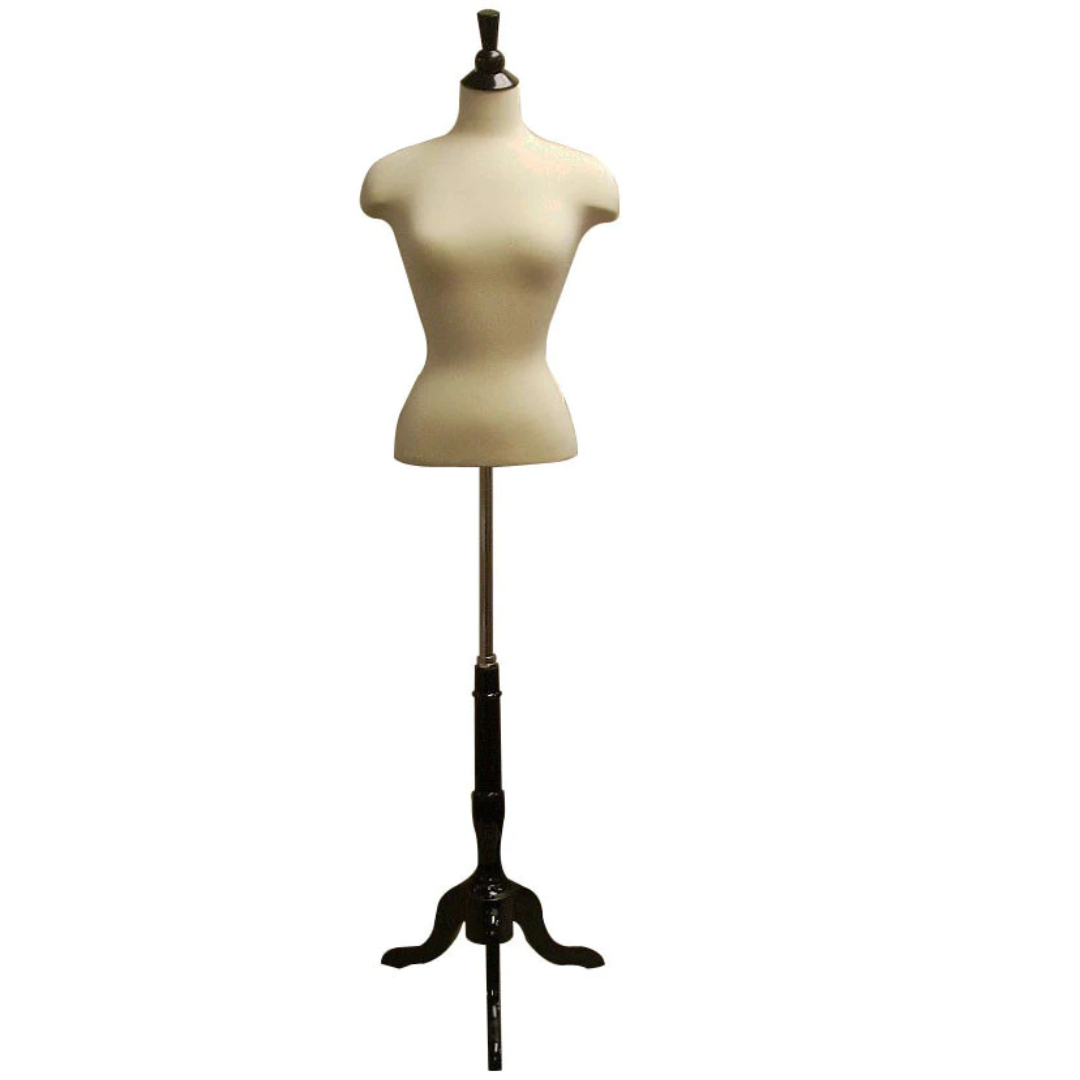 This pin-able French style dress form has shoulders and comes on a wood tripod base -- Black, Natural, or White -- with matching neck cap.