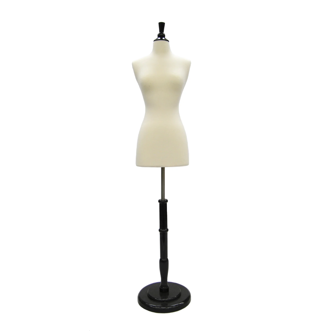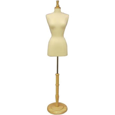 This French style dress form comes on two round wood base options -- Natural or Black - with a matching neck cap. The stand is adjustable so that the form can elevate to a height of over 5 1/2 feet.