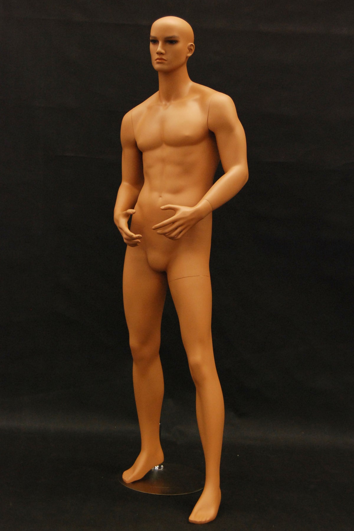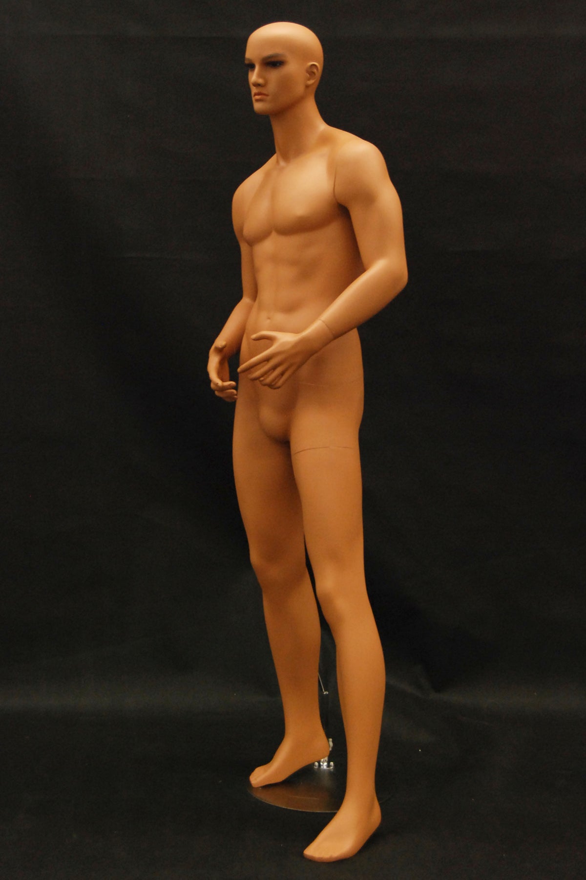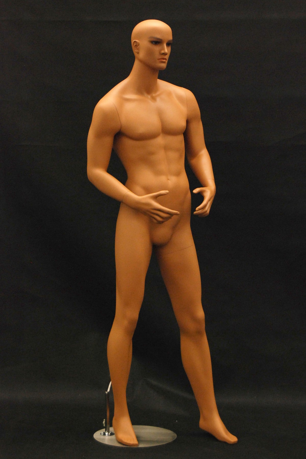 This mannequin has realistic features, tanned "skin," and a strong body type.