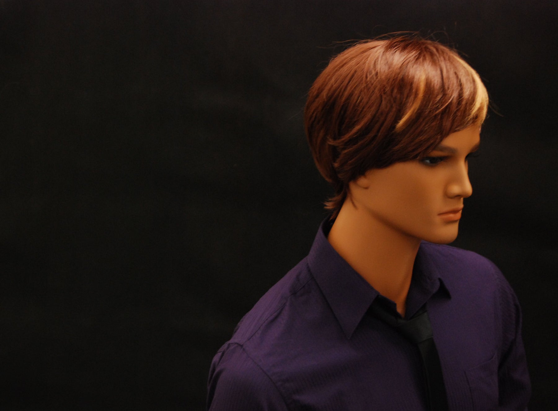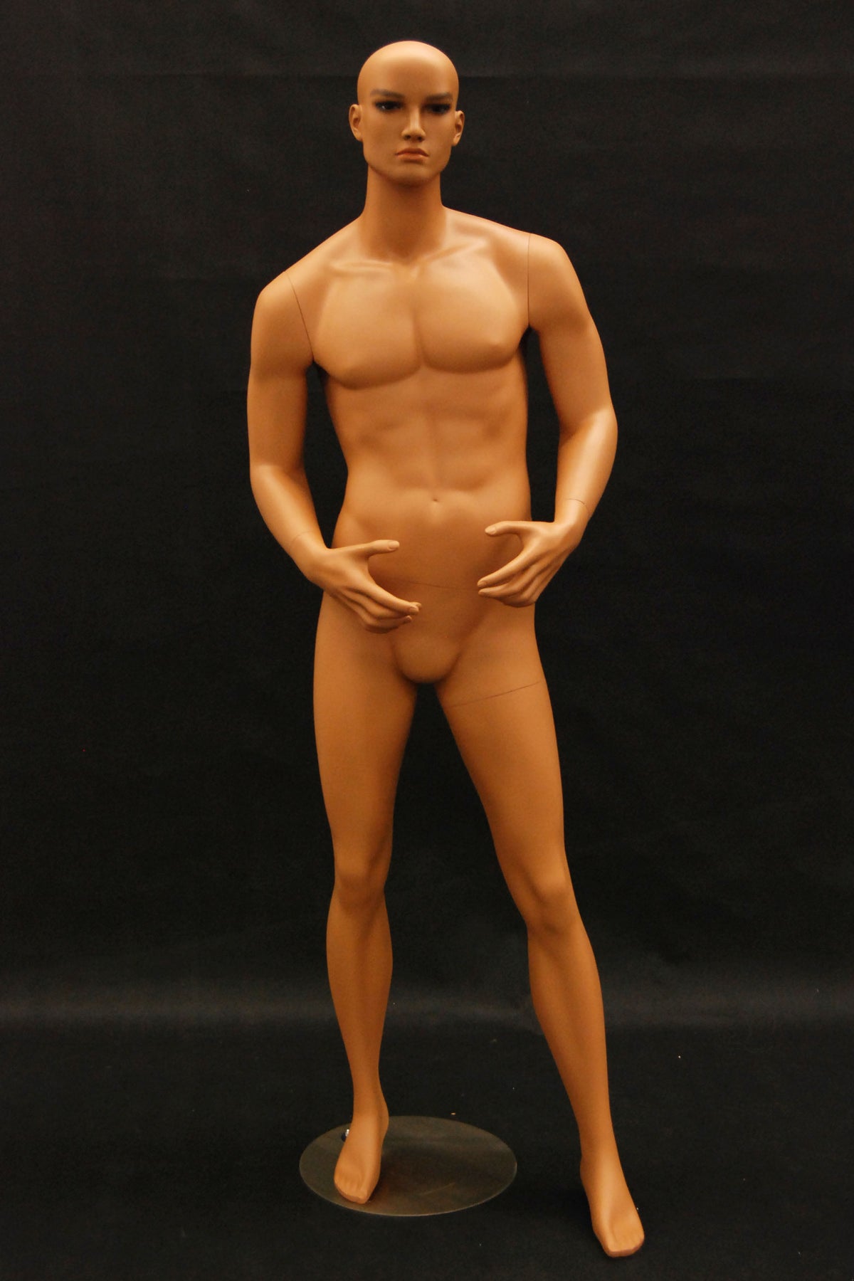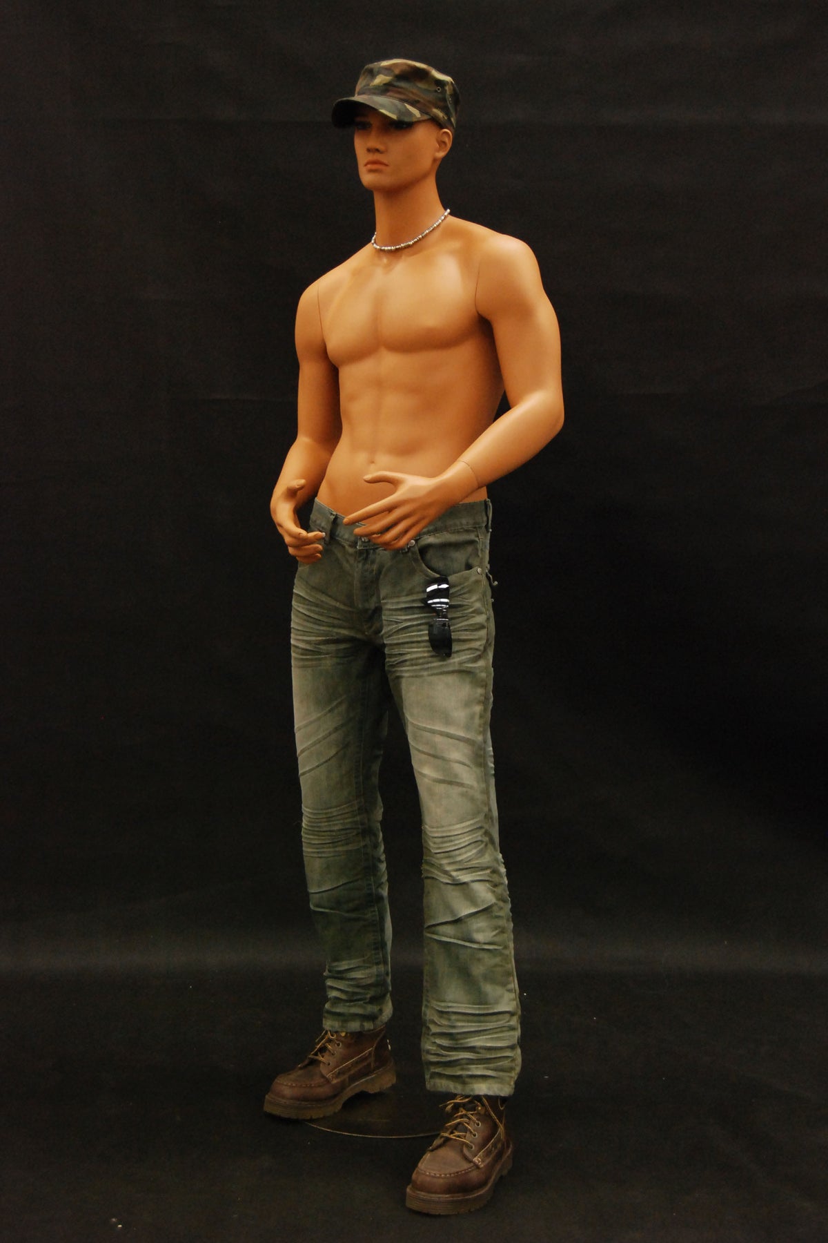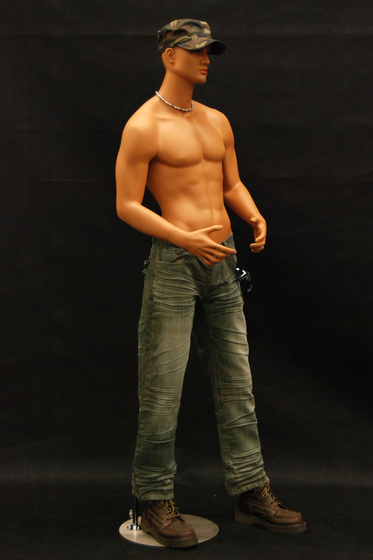 This mannequin has realistic features, tanned "skin," and a strong body type.