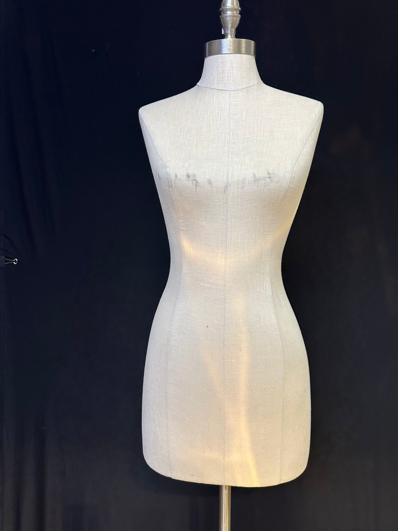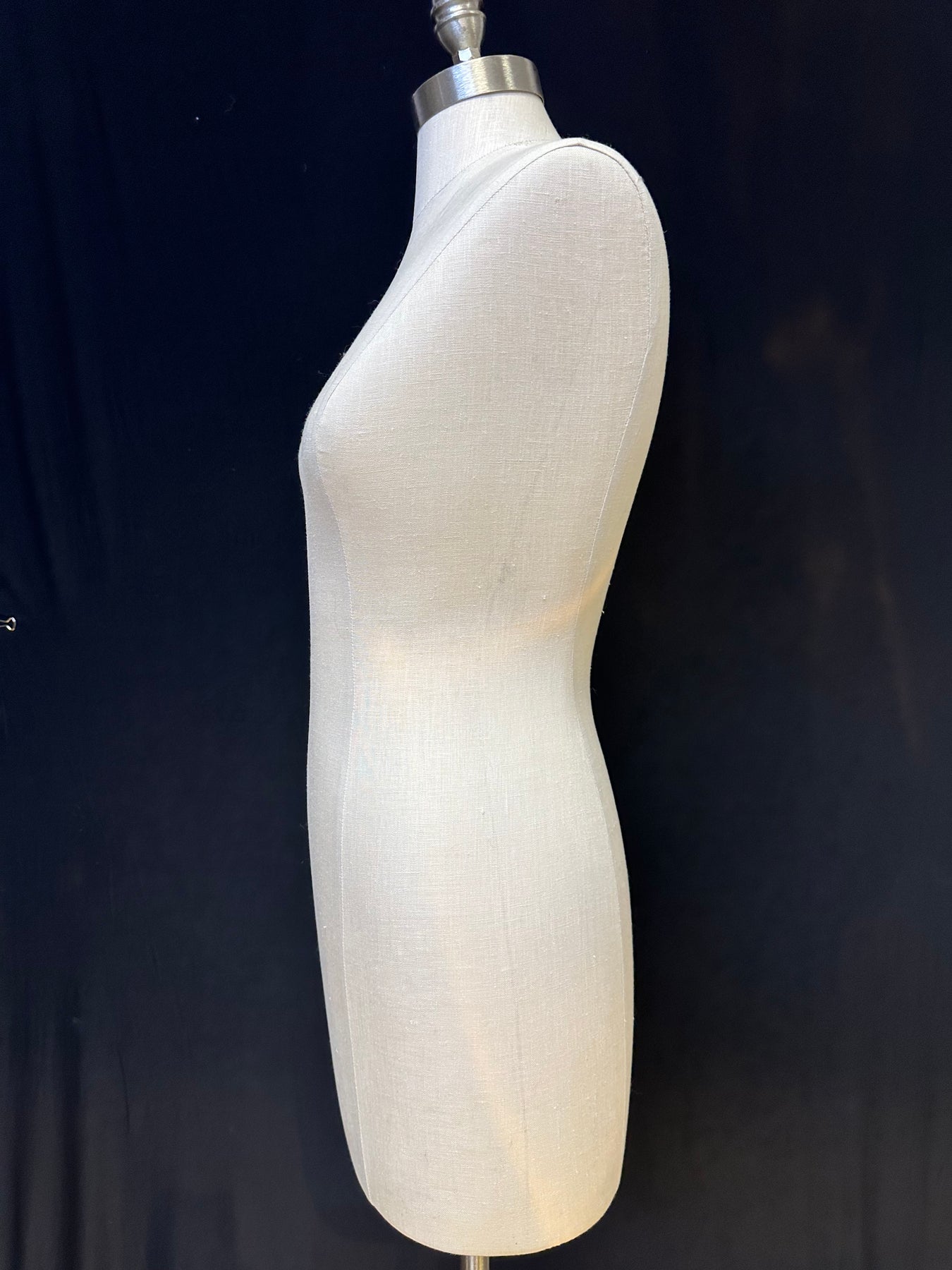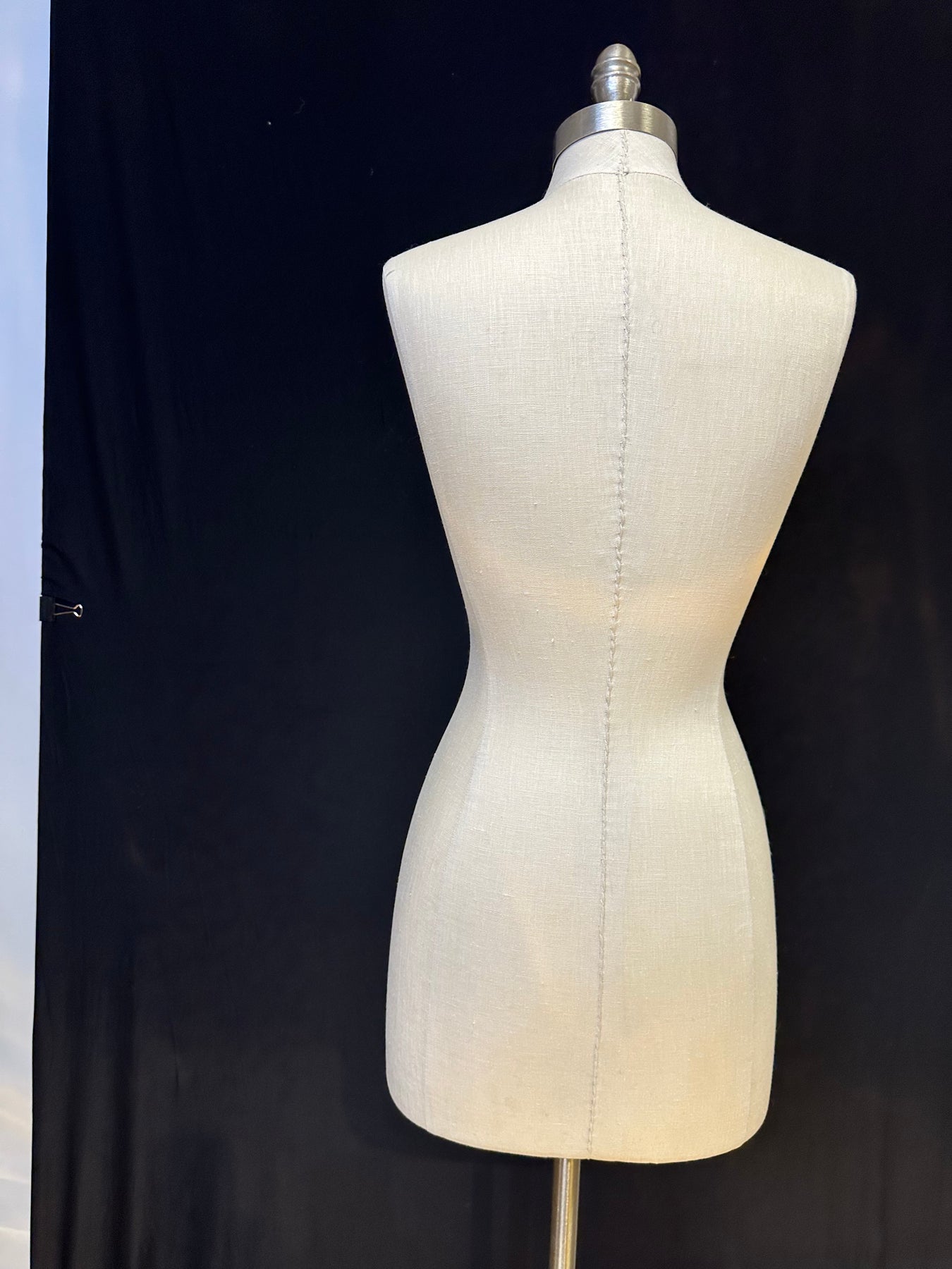 Upgrade your sewing room or boutique with this used female dress form designed for draping, fitting, and fashion display. This pinnable dress form features durable fabric that holds pins securely, making it ideal for patternmaking, tailoring, and garment construction. The chrome neck cap adds a polished, professional look, while the rolling base on wheels allows you to move the form easily around your studio or workspace.