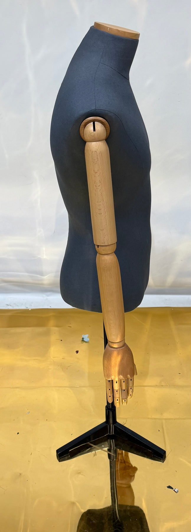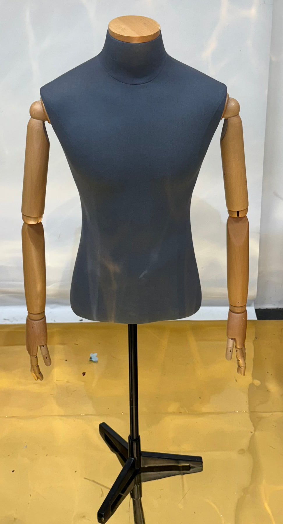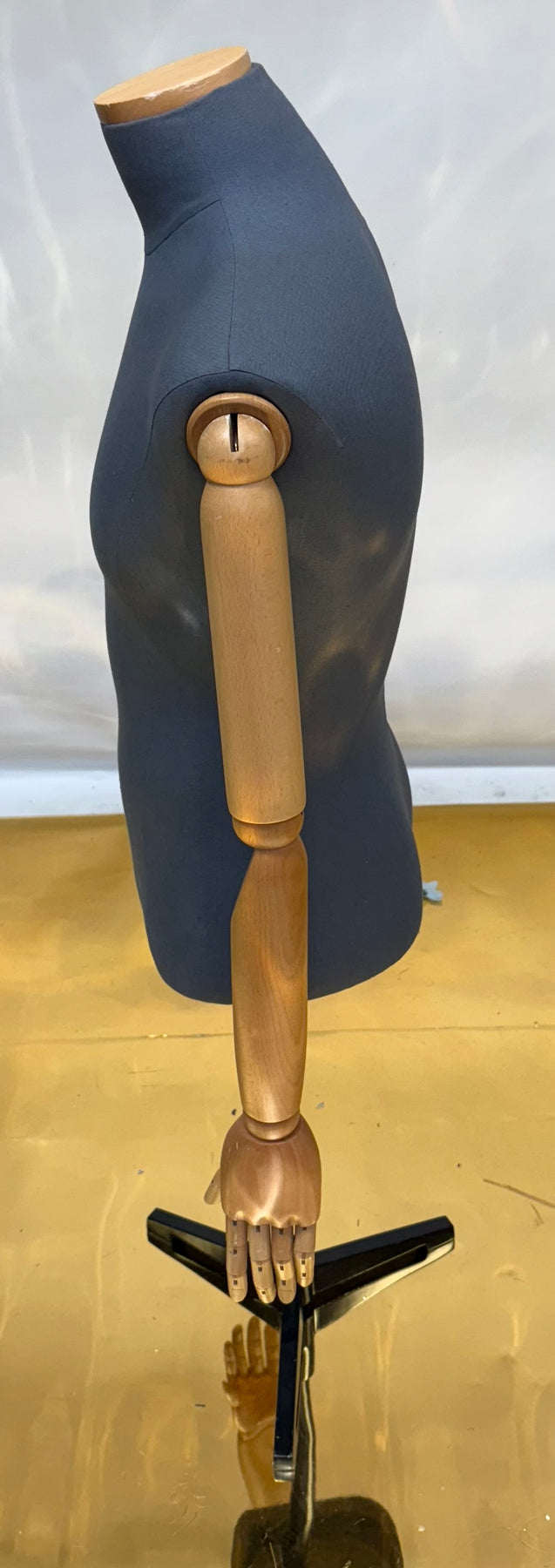 This male dress form is on a table top height stand. The jersey fabric is pinnable